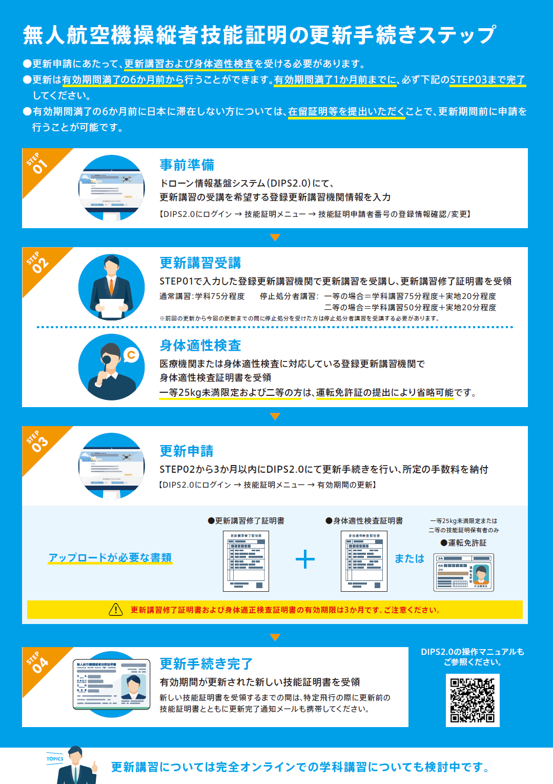 ・更新講習受講後、DIPS2.0にて更新手続きを完了する必要があります。手続き完了後は必ずDIPS2.0から手続きの完了を通達するメールが来たことを確認してください。